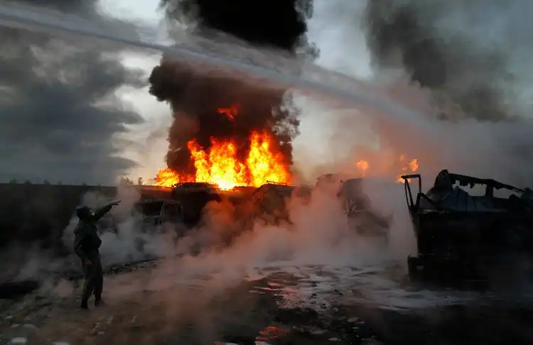 Афганский полицейский указывает на горящие цистерны НАТО, которые подожгли боевики, в округе Бехсод, провинция Нангархар, 14 ноября. Боевики подожгли колонну автоцистерн НАТО в восточной части Афганистана, в то время как взрыв бомбы на юге стал причиной смерти военнослужащего сил НАТО и других гражданских.