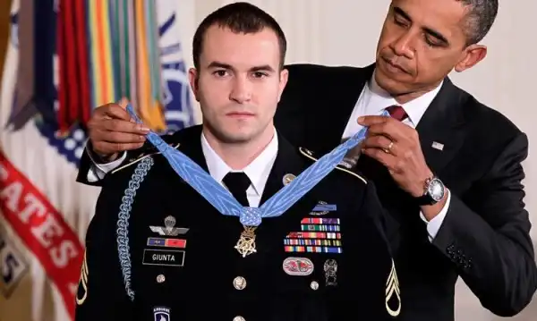 Президент США Барак Обама вручает орден почета сержанту Сальваторе Джунта, который спас двух своих товарищей в октябре 2007 года, во время войны в Афганистане. Президент вручил орден в Белом доме 16 ноября.