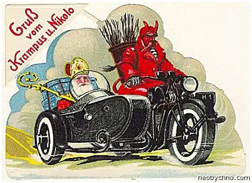 В семье, как известно, не без уродов. В Австрии новогодия вместе с Сент Николасом обслуживает страшный Крампус, который у доброго деда вместо оленей — возит его на старом вермахтовском мотоцикле.