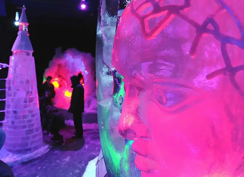В Ледяном дворце установлены скульптуры на создание которых ушло около 90 тонн льда, выращенного из родниковой воды.