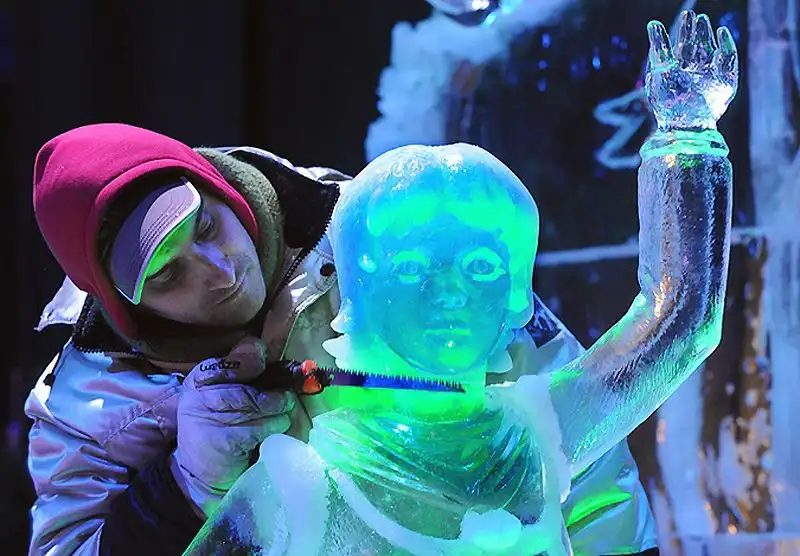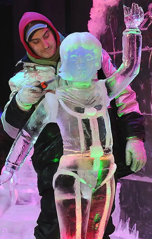 Ледяные скульптуры со временем начинают “плыть”, поэтому их нужно время от времени подновлять. На фото молодой человек, у которого своя фотостудия в СПБ, также решил попытать свои силы в этом удивительном фестивале.