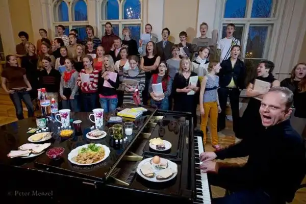 Учитель пения и композитор Анси Саука репетирует с Камерным рижским молодежным хором в столице Латвии Риге. На крышке рояля специально для фотографа расставлен его обед. Анси Саука 36 лет, рост 182,8 см и вес 82,8 кг. Энергетическая ценность его дневного рациона составляет 3200 ккал. Вообще, работа пианиста требует довольно значительных энергозатрат. Так, музыкант с параметрами, как у Анси Саука, за один час игры на рояле сжигает около 110 ккал.