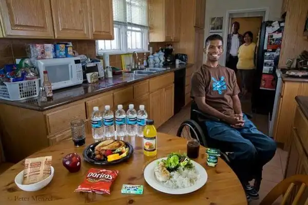30-летний ветеран войны в Ираке Фелипе Адамс демонстрирует свой суточный рацион. Сейчас он живет вместе со своими родителями в Инглвуде, штат Калифорния. При росте в 177 см и весе в 61 кг молодой человек в сутки потребляет 2100 ккал. Сейчас Фелипе Адамс прикован к инвалидному креслу. Когда он служил в Багдаде, то получил тяжелое ранение от снайперской пули, закончившееся параличом ног. До сих пор молодой человек страдает от сильных фантомных болей, которые ежедневно возникают в поврежденных нервах.