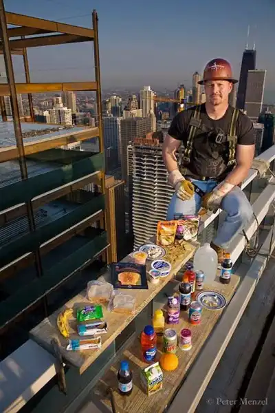 Монтажник Джефф Девайн из Чикаго съедает свой ежедневный обед прямо на рабочем месте – то есть на высоте 50-го этажа строящегося дома. У этого человека физически тяжелая работа, связанная с длительным пребыванием на открытом воздухе. Поэтому он может позволить себе плотно пообедать. Калорийность его суточного рациона достигает 6600 ккал в день. Его рост составляет 185 см, вес 106 кг, возраст 39 лет. То есть он в прекрасной физической форме. Джефф Девайн внимательно относится к своему здоровью, поэтому он не пользуется услугами кафе быстрого питания, а предпочитает приносить с собой еду, которую приготовили дома.
