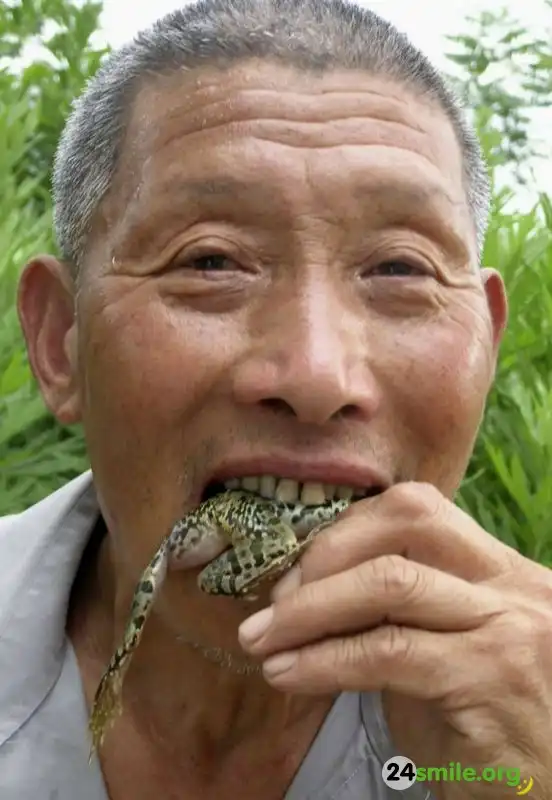 Мужчина ест живую жабу, которая должна помочь ему в лечении брюшной полости живота.