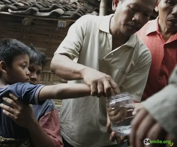 Девятилетний мальчик, который, по мнению местных жителей, обладает даром целителя, кладет в банку с водой волшебный камень во время массового сеанса исцеления в области Джомбанг, остров Ява, Индонезия.
