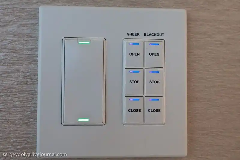 Светом и шторами можно управлять и с отдельных выключателей, вмурованных в стены: