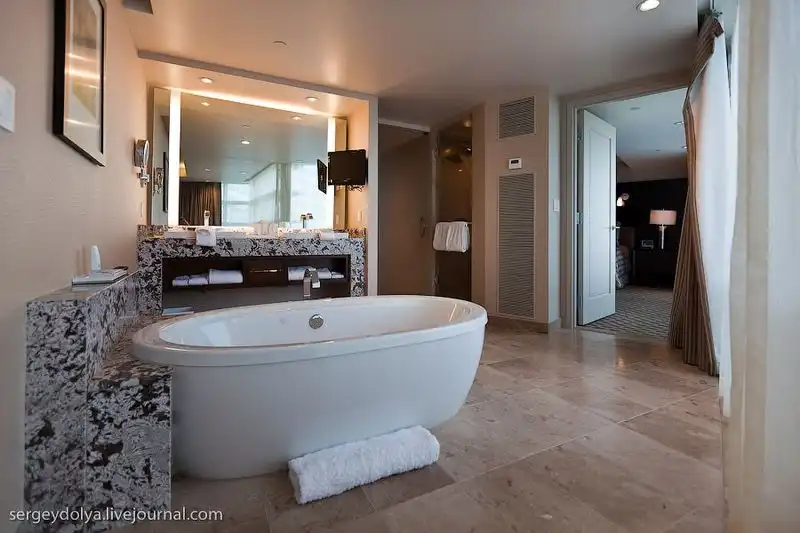 Ванная комната заслуживает отдельного внимания. Она огромна. Тут даже стоят 2 кресла. Видимо, чтобы любоваться женой, пока она нежится в ванной, и поглядывать на бурлящий внизу Лас-Вегас: