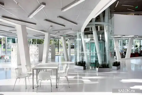Эта мультимедийная библиотека в Вентспилсе (Латвия) - уникальное пространство. Во-первых, здесь нет ни одной лестницы. А на второй уровень можно подняться по спиральному пандусу. Вдоль него расположены стеллажи с книгами. Это было сделано прежде всего для людей с ограниченными возможностями. По всей библиотеке они могут передвигаться совершенно свободно. Во-вторых, все архитектурные элементы как бы перетекают один в другой и образуют единую несущую конструкцию. Фасад библиотеки облицован тонкой листовой медью. На эти панели нанесены фрагменты рукописи знаменитого латвийского фольклориста и писателя Кришьяниса Баронса.
