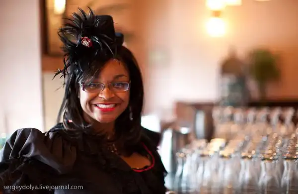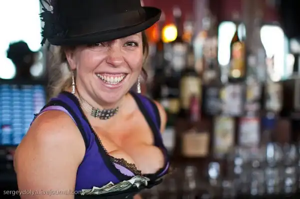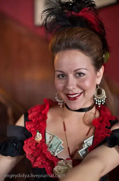 в городе постоянно находилось около 14 000 золотоискателей и их "обслуживали" 300 девушек. Сеанс длился 15 минут и стоил 5 долларов.
