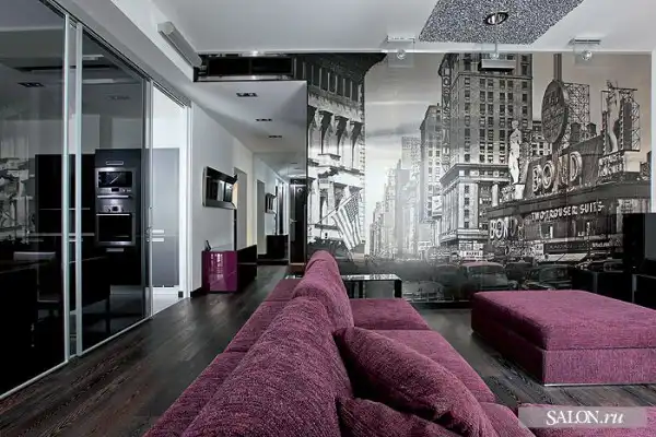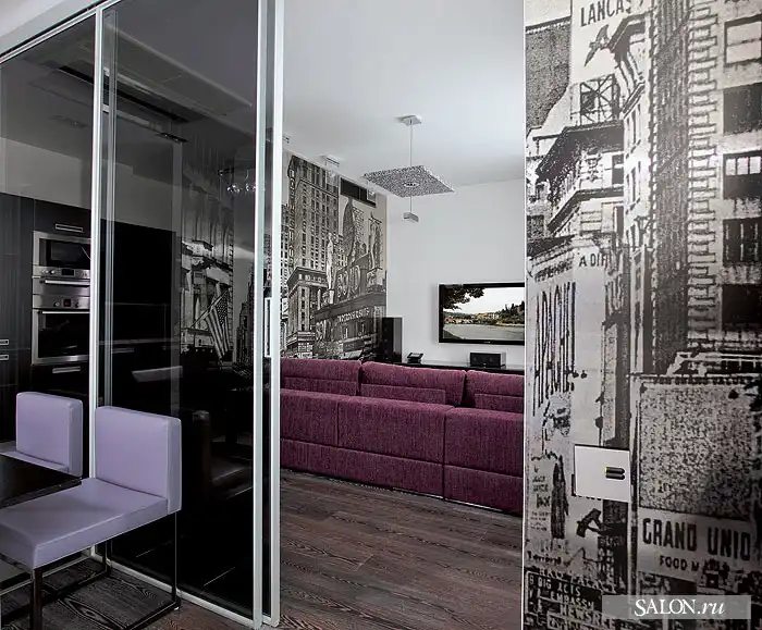 И кухня, и гостиная выдержаны в единой гамме: черно-белая панорама города на фотографиях прекрасно сочетается с антрацитовым оттенком кухонных фасадов, а нежно-лиловый тон столешницы, фартука и стульев (Minotti) пере кликается со сливовым цветом дивана.