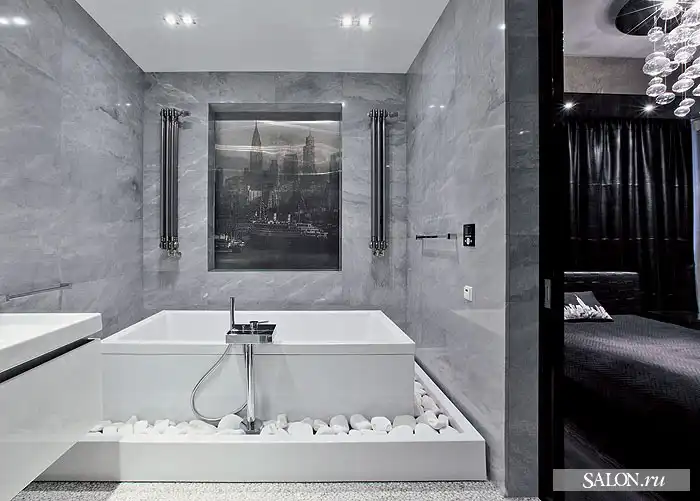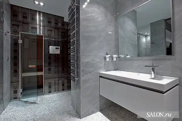 Ванная комната спроектирована таким образом, что в ней поместилось все, что хотел заказчик, - огромная душевая кабина, двухместная сауна, умывальная зона и отдельностоящая ванна на подиуме, выложенном камнями. Ниша в стене декорирована панно из нер жа веющей стали с фотографией Нью-Йорка, узкие стальные радиаторы по обе стороны работают как элементы дизайна. Стены помещения облицованы редким итальянским мрамором Grigio Paris. На полу - натуральная галька в смоле, Riverstone