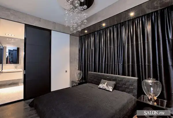 Стены и потолок в спальне отделаны панелями из канадского клена. Массивная занавесь из черной кожи служит декоративным фоном для кровати с кожаным изголовьем (Minotti) и защищает от яркого солнечного света. За раздвиж ными дверями, обитыми черной кожей, - ванная.