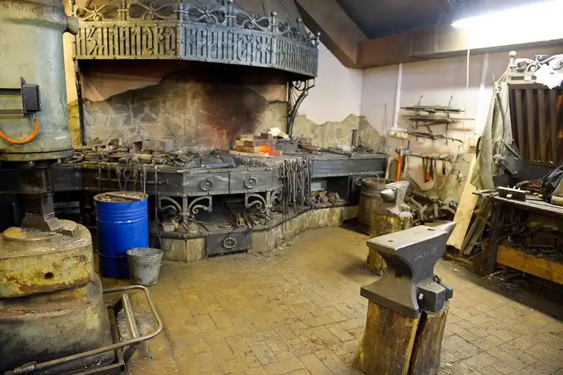 2. До сих пор я был только в больших кузнечных цехах крупных заводов, и только представлял, как могла бы выглядеть кузница творческого человека. За дверью я увидел ровно то, что рисовало мне моё воображение: просторное помещение, несколько усыпанных крошевом окалины наковален, пышущий жаром горн, у которого висит множество щипцов разной формы. На верстаках – инструменты и обрезки металла. Правда, вместо дюжего детины-молотобойца в кузнице стоял гидравлический молот.