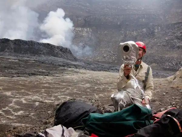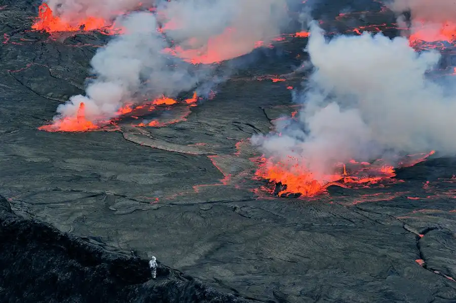 Просто нереальные фотографии. В центре этого кратера расположено озеро лавы, которое то засыпает, то оживает вновь. Спускаться к нему опасно без специального снаряжения. Дым и серные испарения могут убить. Да и жара стоит просто адская - выжить без защитных костюмов возле озера нереально - сгоришь в прямом смысле слова.