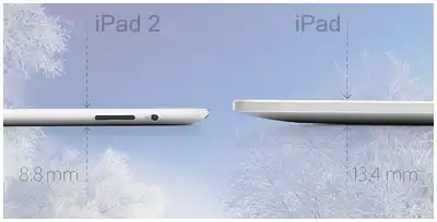 Физически же и в цифрах второй айпад тоньше первого на треть! Толщина iPad – 13.4 миллиметра, а iPad 2 – 8.8 миллиметра. По высоте и ширине iPad 2 также срезал несколько миллиметров. По большей стороне 24.1 сантиметр (у первого было 24.3 сантиметра), по меньшей стороне 18.6 сантиметров (был 19 сантиметров). Вес также полегчал, iPad 2 весит 613 грамм, а белая версия даже на несколько грамм легче (прежний вес был 680 грамм у версии iPad Wi-Fi и 730 грамм у версии iPad Wi-Fi + 3G).