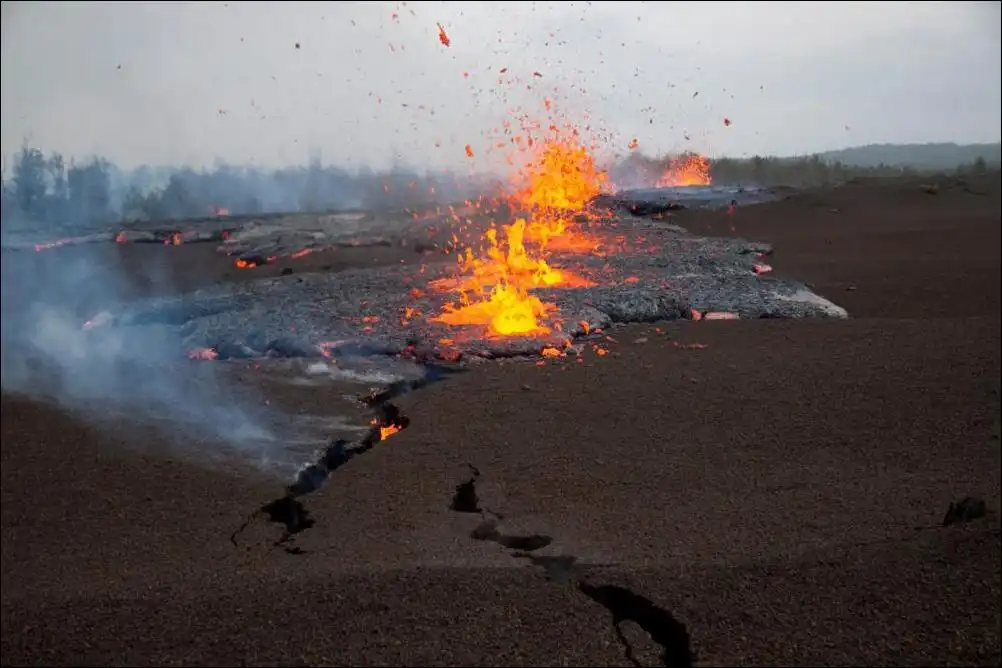 В земной коре стали появляться трещины из которых бьют фонтаны лавы на несколько десятков метров ввысь.