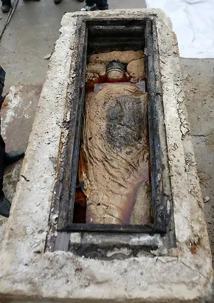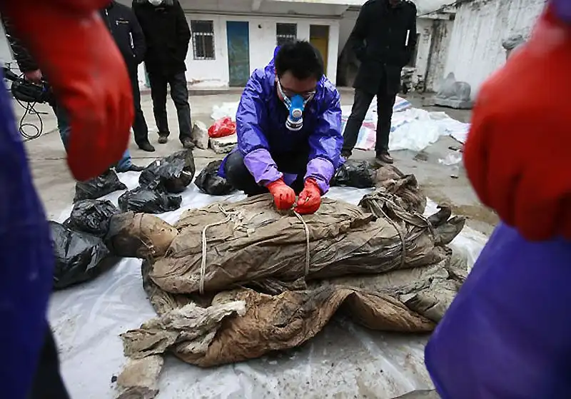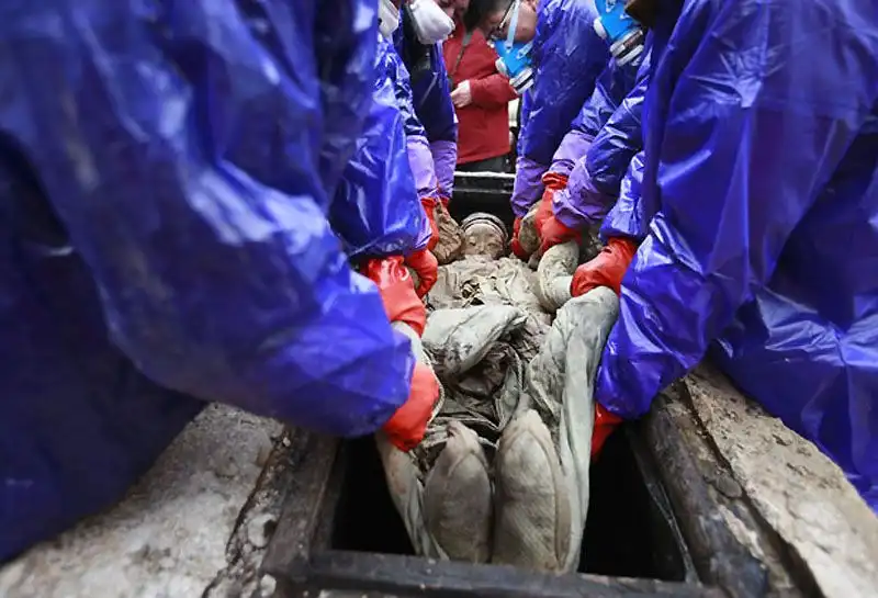 4. В двух гробах при эксгумации были найдены скелеты, одежда времен династии Мин и погребальные принадлежности, в то время как в третьем гробу лежало хорошо сохранившееся мумифицированное тело женщины.