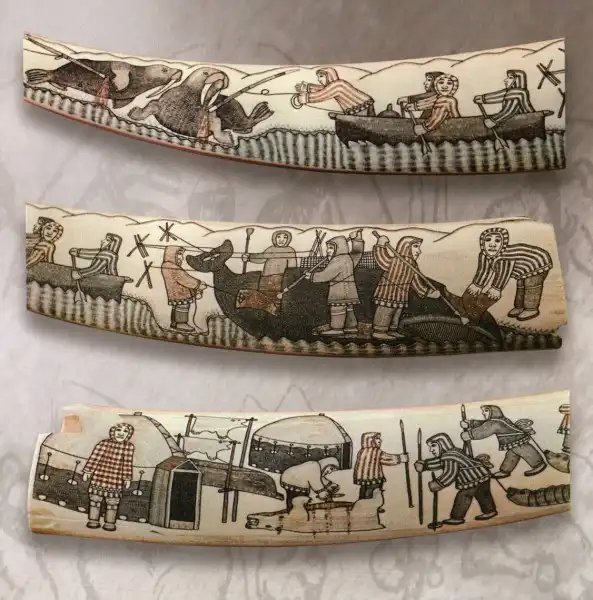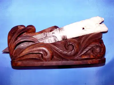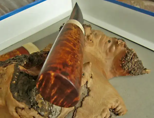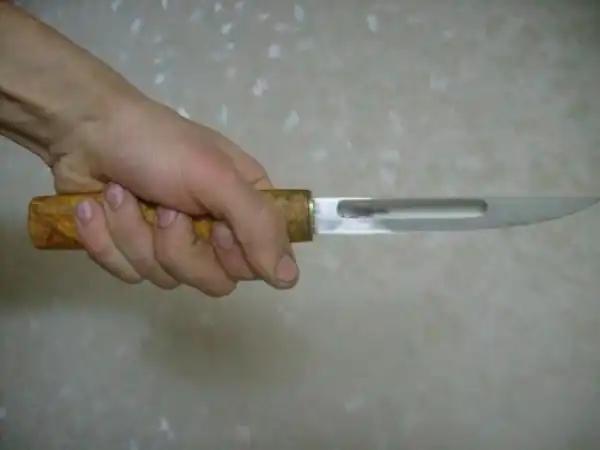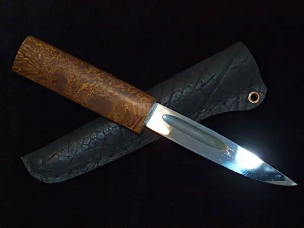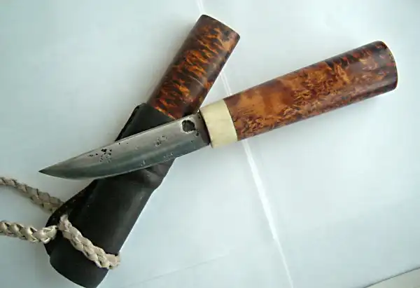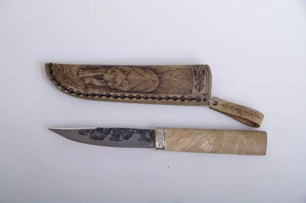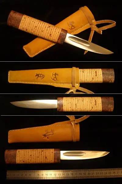 Рукоятка ножа традиционно делается из берёзового капа пропитанного специальным маслом. Ручка ножа в сечении напоминает яйцо, острым концом «яйцо» направлено в сторону лезвия лишена каких бы-то ни было упоров, гард и пр. — простая прямая рукоять. Длина рукояти 130—150 мм, что длиннее ширины мужской ладони. Длинная ручка объясняется не только соображениями удобства, но также и тем, что нож не должен тонуть в воде. Кроме березового капа используются наборные ручки из бересты(кусочки бересты накладываются друг на друга(могут сразу надеватся на хвостовик лезвия), между слоями промазываются клеем, дают засохнуть под прессом и из этой заготовки изготавливают рукоять). Ножи с ручкой из мамонтовой кости, пластика и пр. являются сувенирной продукцией и не используются в повседневной жизни.