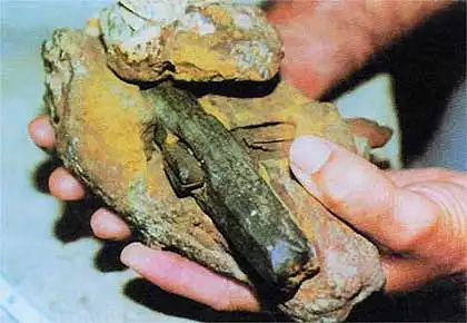 Головоломную загадку для науки представляет собой... обыкновенный с виду молоток. Металлическая часть молота имеет длину 15 сантиметров и диаметр около 3 сантиметров. Он буквально врос в известняк возрастом порядка 140 миллионов лет, так и хранится вместе с куском породы. Это чудо попалось на глаза миссис Эмме Хан в июне 1934 года в скалах неподалеку от американского городка Лондон, что в штате Техас. Эксперты, осматривавшие находку, вынесли единодушное заключение: мистификация. Однако дальнейшие исследования, проводившиеся различными научными учреждениями, в том числе знаменитой Баттелевской лабораторией (США), показали, что все обстоит гораздо сложнее.