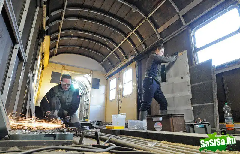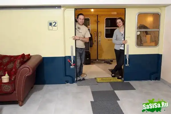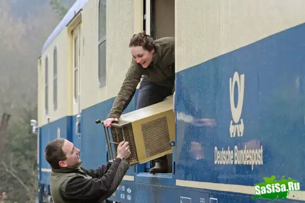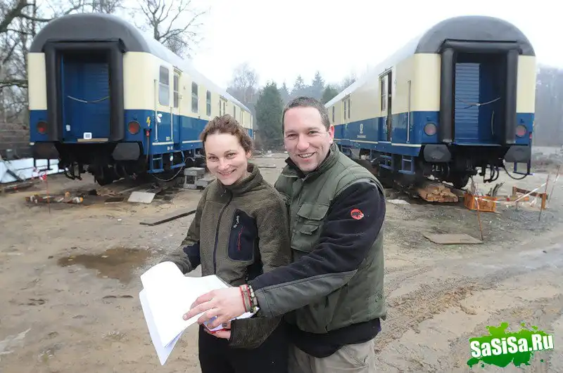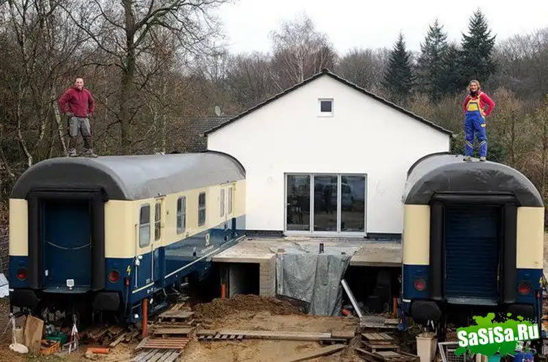 Считается, что в вагонах живут одни бедняки или бообще бездомные. Но молодожены из Германии Ванесса Сталбаум и Марко Степняк нарочно устроили себе дом в двух вагонах. Свой первый совместный отпуск Марко и Ванесса провели в путешествии по железной дороге в Казахстан. Им так понравилось путешествовать на поезде, что у них родилась мечта жить в вагоне. Недавно они осуществили свою мечту. В интернете Марк нашел два старых железнодорожных вагона произведенных в 70-х годах по цене ? 20 000. Перевезти их из Швейцарии в Германию стоило еще 6 тысяч евро. Они наняли архитектора, позвали друзей и родственников, чтобы построить дом-перемычку между двух вагонов, и привести их в порядок. Один вагон переоборудовали в кухню, второй под ванную комнату, а посередине построили гостиную. Работы было много, и она не была легкой, да еще пришлось взять кредит на 16 лет, но Ванесса и Марк счастливы иметь обладать таким необычным домом.