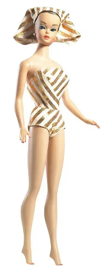 Не уверены насчет шляпки, но разве может не понравиться этот купальник с юбкой в оборочку? Мисс Барби стала первой куклой с гнущимися ногами и глазами, которые открываются и закрываются. У нее первой также появился собственный набор париков. (Mattel)