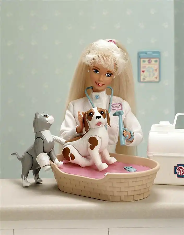 «Щенок повредил лапку, у котенка грипп» – говорили в рекламе этой куклы Барби – Ветеринара, у которой были розовые леггинсы под белым халатом. (Mattel)