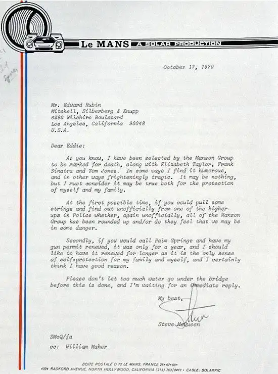 15. Письмо Стива МакКуина об угрозах Чарльза Мэнсона. (REX FEATURES)