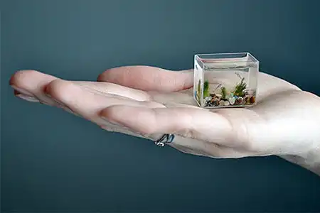 Его размеры вы можете видеть уже на анонсной фотографии. Кстати, в аквариуме содержится всего 10 мл воды - столько же содержится в ампуле с лекарством. Но это полноценный аквариум, с камешками и растениями на дне, с рыбками, которые с удивлением взирают на все происходящее. По-видимому, это мальки рыб, а не взрослые рыбы, но я могу и ошибаться. В продолжении можно найти видео и картинки, которые демонстрируют нам экосистему аквариума в деле.