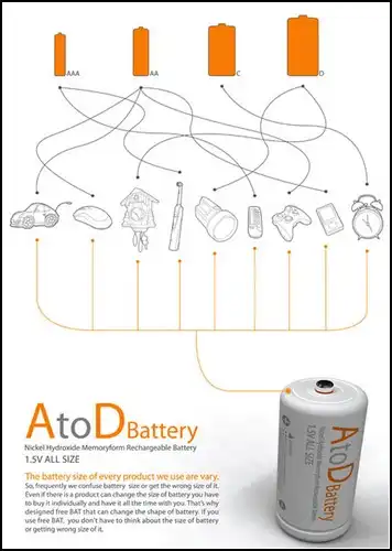 Батарейки могут иметь различные формы. И даже пальчиковые батарейки могут иметь некоторое количество видов. Вот для того, чтоб иметь возможность видоизменять батарейку, зависимо от разных устройств, для которых она нужна, и сотворен концепт под заглавием AtoD. Он представляет собой аккумулятор, наружняя часть которого изготовлена из пластичного материала. Так что необходимо всего только помять AtoD в руках, чтоб перевоплотить АА в ААА либо даже в С.