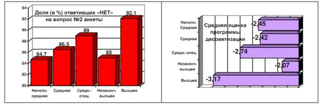 Эти данные, кроме того, косвенно ещё раз намекают нам, что верить в чудовищность Страны Советов несколько более характерно как раз для людей, которые меньше стремятся разобраться в своём мировоззрении, — ведь чётко определившиеся в вере или неверии, получившие высшее образование, не одобряют десоветизацию сильнее. То есть, желание разобраться в среднем приводит человека к просоветским убеждениям, а не наоборот, как то заявляют либералы.