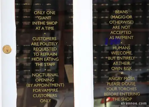 Однако существуют разумные ограничения. В магазине может находиться только один великан. Посетителей просят воздержаться от дегустации товаров, не отходя от кассы. Если ночью постучать в двери магазина, то откроют только вампирам по предъявлению аусвайса. В качестве средства оплаты товара не принимаются волшебные бобы, а только кэш.