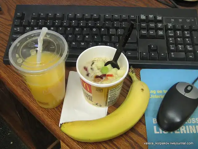 Усаживаюсь в офисе за компьютер, проверяю почту, читаю френдленту. Поедаю овсяную кашку из МакДональдса, запивая апельсиновым соком. Приложил банан из своих закромов.