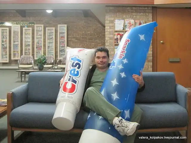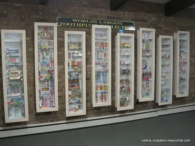 Обхожу здание. Вот моя коллекция зубной пасты, самая большая в мире.