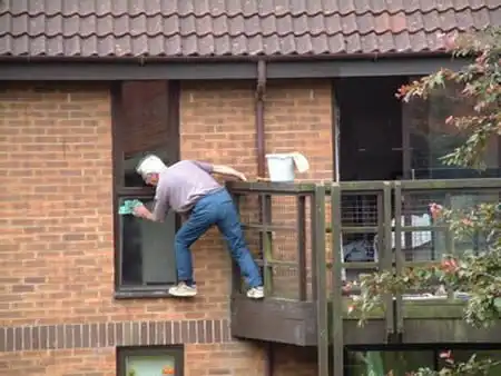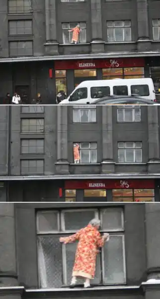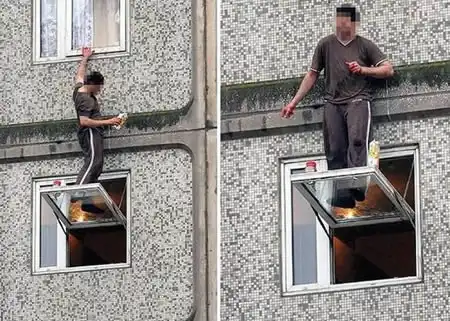 Мне кажется, кроме как глупостью, такой способ мыть окон назвать нельзя. Малейшее неправильное движение, и мойщик придет в себя в больнице... Если вообще придет.