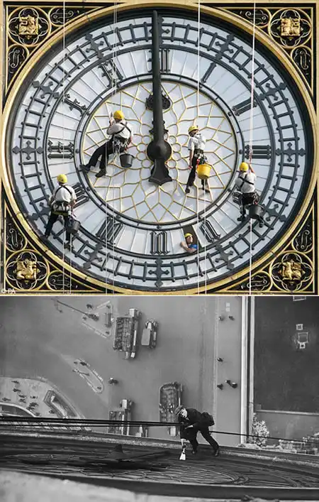 В 2007 году англичане решили помыть циферблат Биг Бена. В принципе, за несколько дней работа была выполнена, причем весьма качественно. А вот в 1930 году эту работу выполнял всего один человек.
