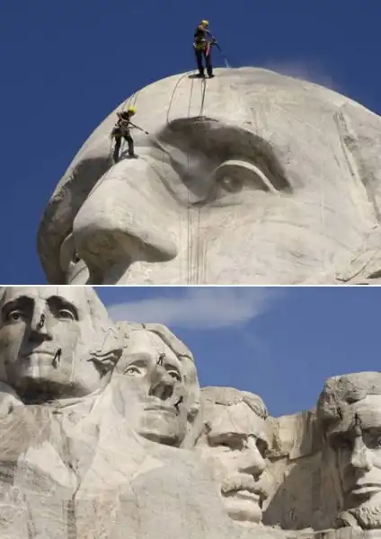 В 2005 году американцы решили помыть лица президентов, которые вырезаны из скалы. Пришлось карабкаться туда со шлангами с холодной водой, подаваемой под давлением. За три недели работа была выполнена, и никто из мойщиков не пострадал.