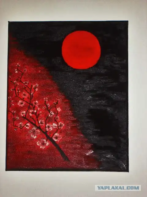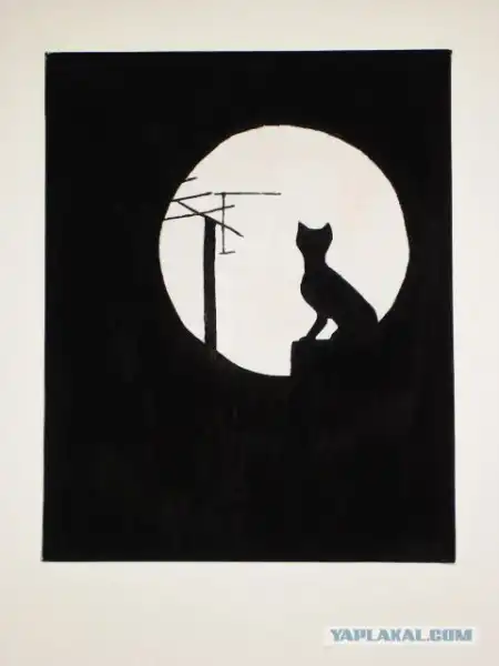 далее - белым на черном я дорисовала антенну (на фото плохо видно, так как отсвечивает) и пришла к выводу что моя луна смотрится дыркой в картине из которой выглядывает ненавистная белая стена. Поэтому я добавила немного красного, совсем чуть-чуть, а еще я решила, что кошка получилась очень худой - и добавила немного живота))