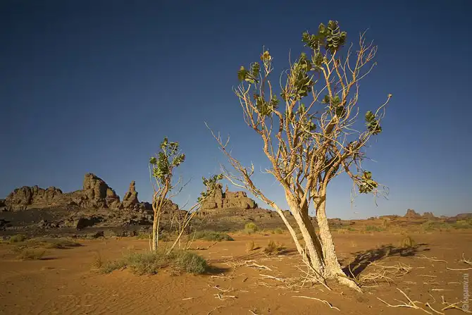 Деревья в пустыне – большая редкость. Процесс рубки всегда был долгий и утомительный. Деревья здесь необычайно твердые. Чтобы отрубить ветку у такого дерева, все три наших проводника махали топором до седьмого пота, сменяя друг друга. Но зато как долго горит это дерево!