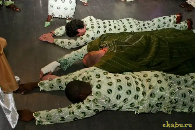 Во время свадебной церемонии народа йоруба, перед тем как выведут невесту, скрытую под вуалью, жених и его друзья падают ниц перед членами семьи невесты. (Photo: Lola Akinmade)
