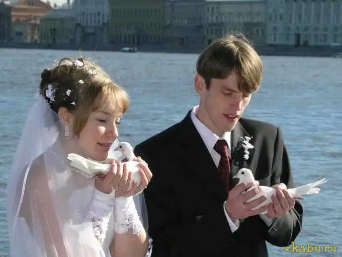 Молодожены отпускают двух белых голубей в знак их любви и согласия. Снимок сделан в Санкт-Петербурге. (Photo: kimpierro)