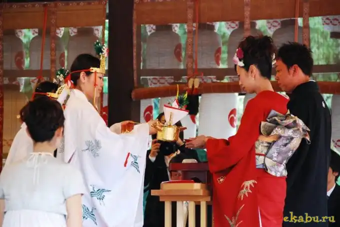 Японские молодожены во время традиционного обряда, во время которого они должны выпить 9 чашек саке. Снимок сделан в синтоистском храме. (Photo: paulsynnott)