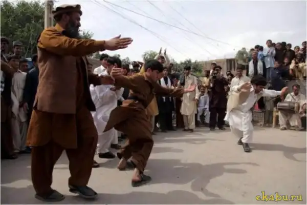 Афганские мужчины танцуют под ритмы армянского барабана дхол на улице в центре Джелалабада. А афганские женщины часто празднуют свадьбу отдельно, не выходя из дома. (Photo: isafmedia)