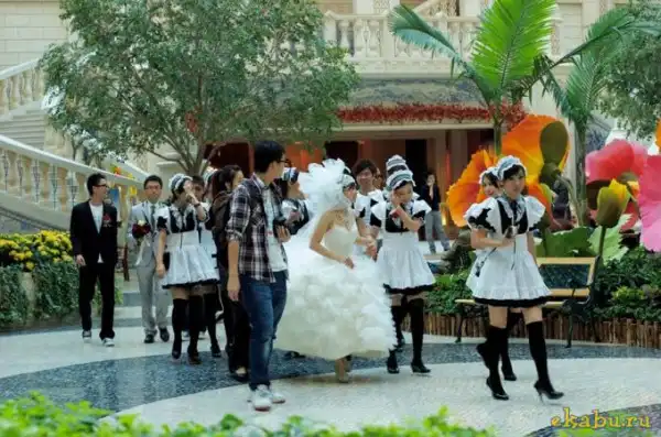 Этот снимок был сделан в отеле-казино Wynn в Макао, новом азиатском центре азартных развлечений. Такая свадьба – совсем не типична для этого региона Китая, который когда-то был португальской колонией – невеста одета в эклектичное белое платье в стиле ретро, а подружки невесты и гостьи – в костюмы в стиле французских горничных.