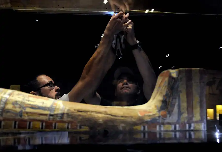 15.Накануне открытия выставки «Мумии мира» в Калифорнийском научном центре сотрудники Эрик России и Джон Дилоски запечатывают стеклянный куб, в котором находятся саркофаг и египетская мумия.