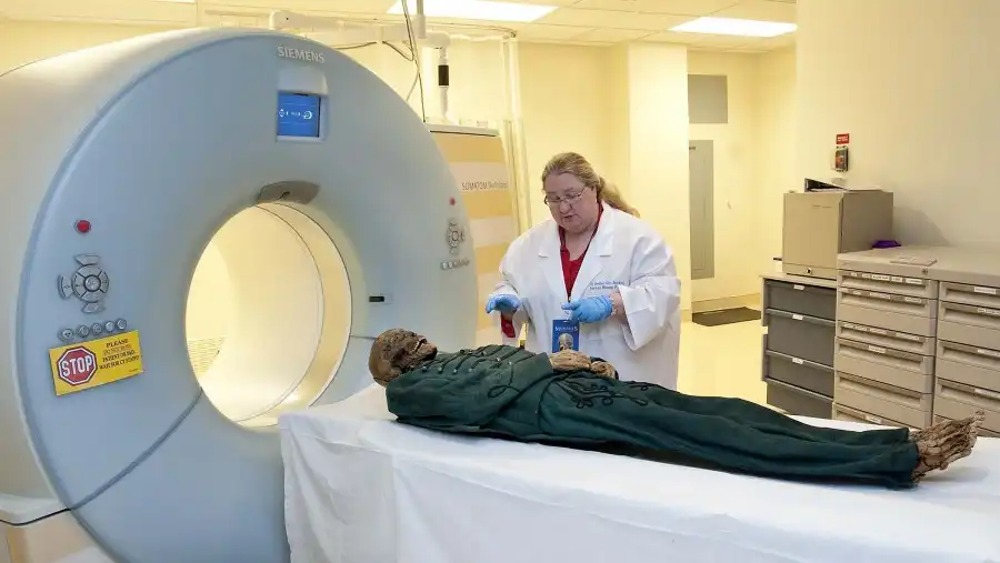 9.23 июня, 2010. Доктор Хитер Гилл-Фреркинг (Heather Gill-Frerking) , служащая в музее Райс-Энгельхорна, рассказывает: «Компьютерная томография и другие научные методы очень помогают в изучении мумий, с их помощью мы можем узнать больше о том, как люди жили и умирали. Подобная техника является неинвазивной и с ее помощью сделать трехмерную запись мумии для архива, что также позволяет нам сохранить мумии для изучения последующими поколениями». Фотография сделана в Медицинском центре «Седар-Синай», Калифорния.