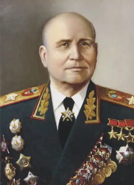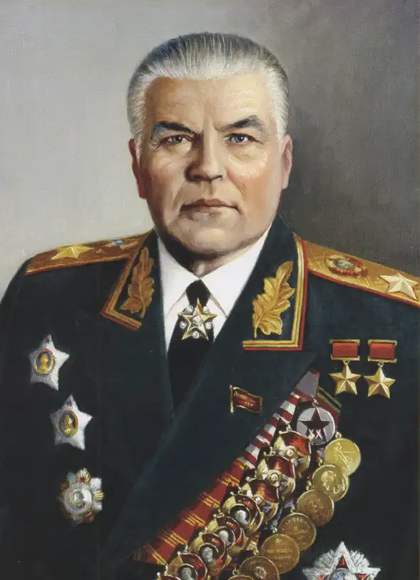 Жуков Георгий Константинович (19 ноября (1 декабря) 1896 — 18 июня 1974) — советский военачальник, Маршал Советского Союза (с 1943), министр обороны СССР (1955—1957). Четырежды Герой Советского Союза, кавалер двух орденов «Победа», множества других советских и иностранных орденов и медалей. В послевоенное время занимал пост Главкома сухопутных войск, командовал Одесским, затем Уральским военными округами. После смерти Сталина стал первым заместителем министра обороны СССР, а с 1955 по 1957 год — министром обороны СССР. В 1957 году исключён из состава ЦК партии, снят со всех постов в армии и в 1958 году отправлен в отставку.