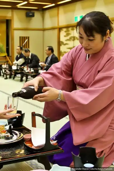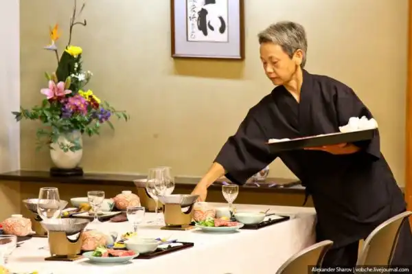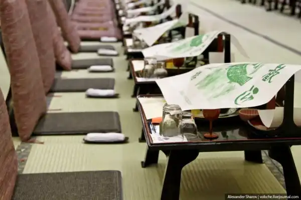 Ужин и завтрак в рёкане входят в стоимость номера (номер стоит примерно 300$ за ночь) и проходят в специальных залах... Конечно, могут и в номер принести, но так как-то интересней! Сидеть надо на полу, но на сиденье со спинкой, это доставляет массу неудобств, ноги начинают ныть через 10 минут, а ужин в Японии, знаете ли, процедура продолжительная... кроме того непонятно куда их (ноги) девать :)) кто под стол, кто в сторону, кто в позе лотоса, а кто под попу...