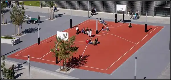 И это не ошибка проектировщиков или строителей. Так было задумано изначально. Inges Idee создавали не спортивную площадку для игры в баскетбол, а общественное пространство, стилизованное под нее. Здесь можно посидеть (или полежать) отдохнуть между занятиями, подготовиться к экзамену или просто провести время в приятной компании с друзьями. Причем, как днем, так и ночью (площадка подсвечивается).
