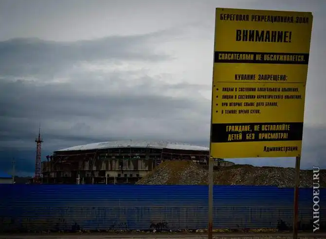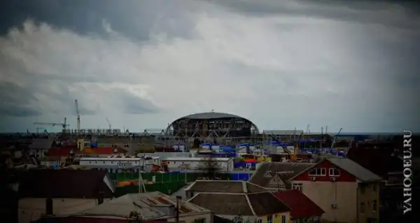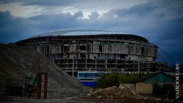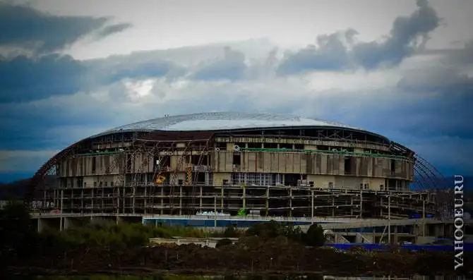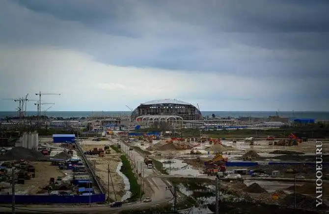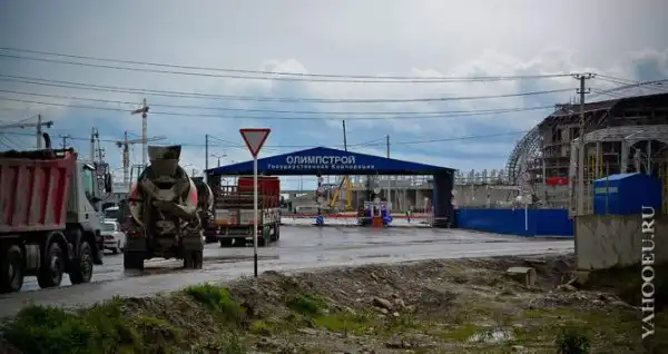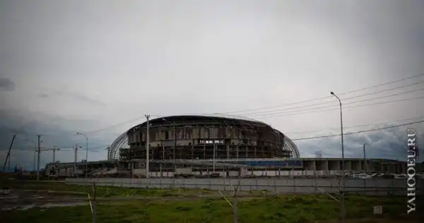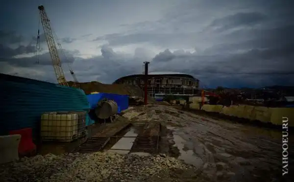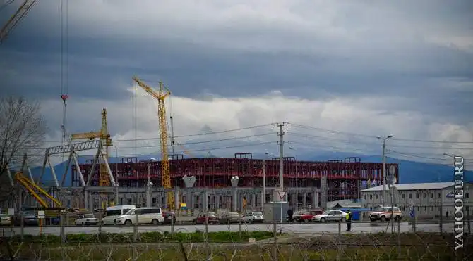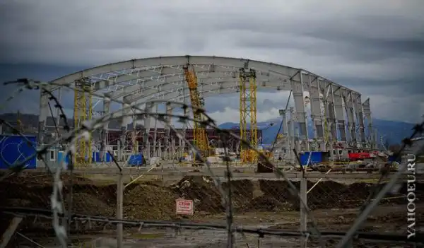 Территория олимпийского строительства хорошо охраняется. Внутрь попасть просто так нельзя. Белые арочные металлические конструкции – будущая ледовая арена для керлинга.